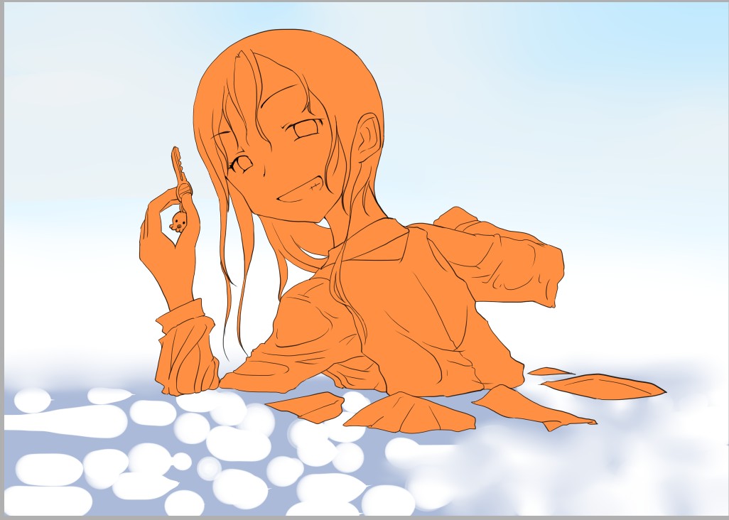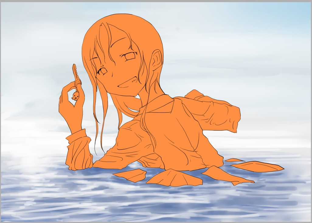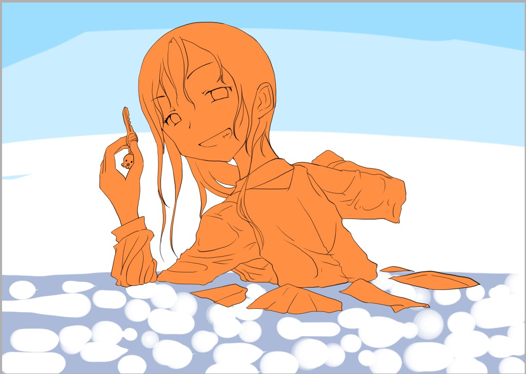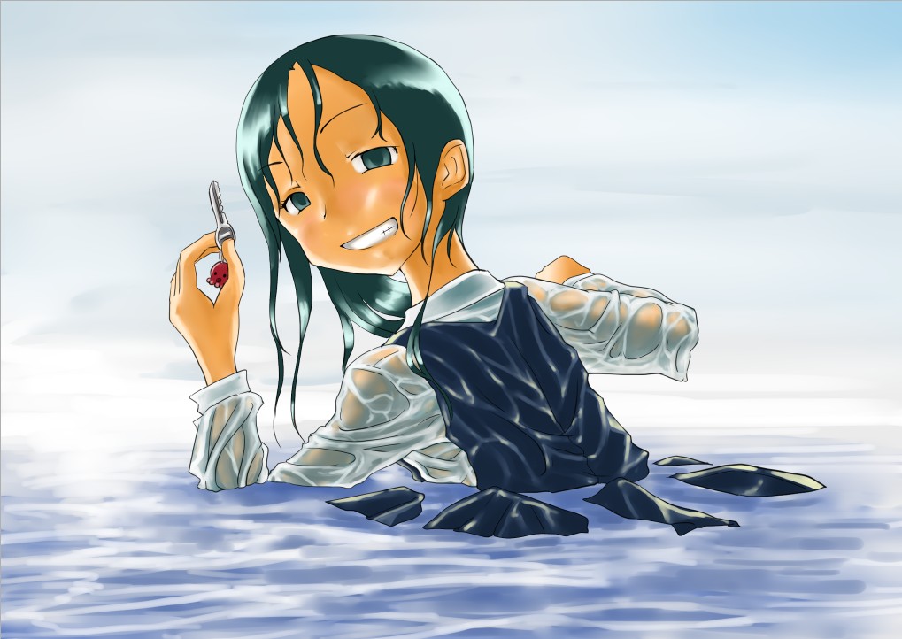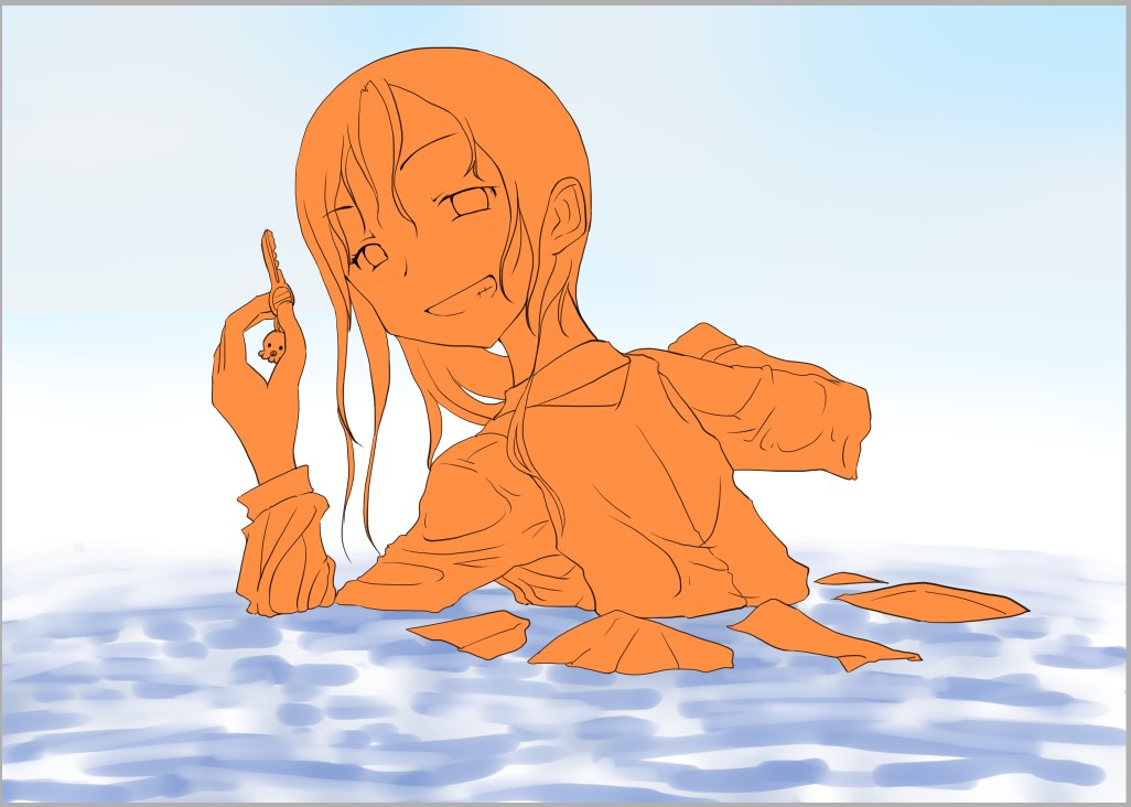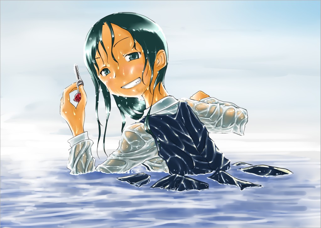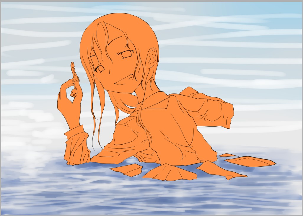 ラスト~!! 2010年10月06日 イベント 0 ようやっと、長かったイベントが終わりそうです…でも現在時刻は23:30…果たして今日中に終われるかな~無理だなまあ、日付をまたいで書きますか~ 瞳を塗っていく。その以前に何気にキーホルダーとか塗っちゃってますけど、まあ、基本は同じように塗ってます。まずは瞳を範囲選択して、適当に影響しない程度に離れているレイヤに色を付けて行く。もちろん新規でおいてもいいですけど、なんだかレイヤが勿体無いような気がするので…貧乏性ってやつですね。 範囲選択しおわったら、ザッと塗ってしまう。塗りのこしができていたらそこもきちっと穴埋めしておきます。塗り終わったら選択範囲を解除して不透明度を保護しておきます。 明るい色を水彩ツールで入れる。大体いつも瞳の色は髪の色から取ってることが多いですけど、明るい色も見ての通り、髪の明るいところの色です。 適度にぼかす。ぼかしと濃い色を再度塗る、明るい色を塗るを繰り返しながら、丁度良くなったと思ったら終了。 瞳に色が入っただけで、一気に絵っぽくなりました~次からはいよいよ、濡れてる水とか光ってる部分を描いていきます。 新規レイヤを一番上に用意。設定は加算にすると、丁度良くテカリみたいな感じになるので、大体いつも水滴とかそういうものは加算。他にも水滴の影をつけてから白で光をいれる方法もありますが、めんどく手間のわりにそれほど濡れてるっぽくならないような気がするので、こうやってます。 で、とりあえず瞳に光を描き入れて… あらびっくり、気づくとこんなに濡らして(ry 水滴を描きながら、髪や肌に一番強い光を入れて行く。その際、あんまりぼかしまくるよりも、元の肌の色とくっきりと分かれ目をつけていく感じだと、一層しっとり、というか、ぬっとりしている感じになる気がします。 とりあえず人物を中心に、体全体を濡らしていきます。大体ハイライト入れるところは人物の淵と、一番光が当たってると仮想するところ、ってかんじでしょうか。 近くで見るとこんな感じ、雫は丸いのは宙にある落下中のもの、垂れているのが肌についてるものって感じです。あと衣服についてはあんまり表面を垂れたりしないので、一番下の、例えばスカートの裾とかリボンの先とか、そういうところから雫がぽたぽた滴り落ちてるように描いていくとそれっぽくなるかもしれません。 そして最終的にぼかす…場所は水が垂れている場合を想像して、一番薄くなっているところ、つまり重力に従うなら上の方をぼかします。…まあ、ようは適当に悪目立ちしない感じにしていくってだけです。 人物の塗が粗方終わったら、最後の調整に入ります。って、ここで0:00になっちまったぜ… 背景と人物の間に新規レイヤを作成、水中をただようスカートを描いていく。ぼやっと、何となく見えるっぽくするために、ブラシなどの境界線があいまいなツールを使って適当に塗っていく。大体、波の暗くなっているところに塗っていけばいい感じ? はっきり描きすぎた場合は、消しゴムで消すよりもぼかした方がかえって目立たないかも。スカートの淵というか裾をはっきり目、それ以外を薄目という感じで描いていく。 何となくそれっぽくなったくらいでおわりにしておくところが肝心。かき込みすぎるとかえって目立ちすぎてしまうので、それとなくっぽくするのを目指す。 波や陽の光など、人物以外のハイライトをいれていく。一番上のレイヤに先ほどと同じように加算レイヤを作り、波に光を当てて行く。大体今まで描いていた上をなぞっていくような感じでしょうか? あと、人物と水面の境目の線画を消すように、上からハイライトを入れて行く。こうすることでより一層、人物と水とが一体化…するような…気がする…?そこらへんは、まあ、適当に。というか、Wetをいままでどれだけ観察してきたか、とかそこら辺の問題と言うよりも、漫画とか絵画の記号表現の一つ…みたいなもんですか? あらかた終わったら、逆にして変なところが無いか修正。波とか集中してかき込みすぎると、結構良く左に傾いていたりするので注意。傾いていた場合は何とか誤魔化す。 やっぱり肌の色が気に入らな方ので修正する。こういう修正を最終段階でする場合が結構多いので、最低限肌と服のレイヤはわけておくと後々便利かも知れませんね。 で、まあ色々とキラキラとかをちょいと描き足したりして、完成です~ ずっと書くのをわすれてましたが、とりあえずこれは105mmX148mm、350dpiで作成しました。出来上がったらとりあえずSAI形式で保存した後、Jpegに直して、いつもはそこからブログ用に50%リサイズしてます。 とまあ、大体こんな感じのが私の現在絵を描く時の全行程でしょうか?他にもあつぬりっぽいのとか、アニメっぽいのとか挑戦中ですが…はっきり色分けするのが苦手で、中々難しいですねぇ~まあ、そっち方面はおいおいって感じでしょうか?とまあ、一週間ほど続けて