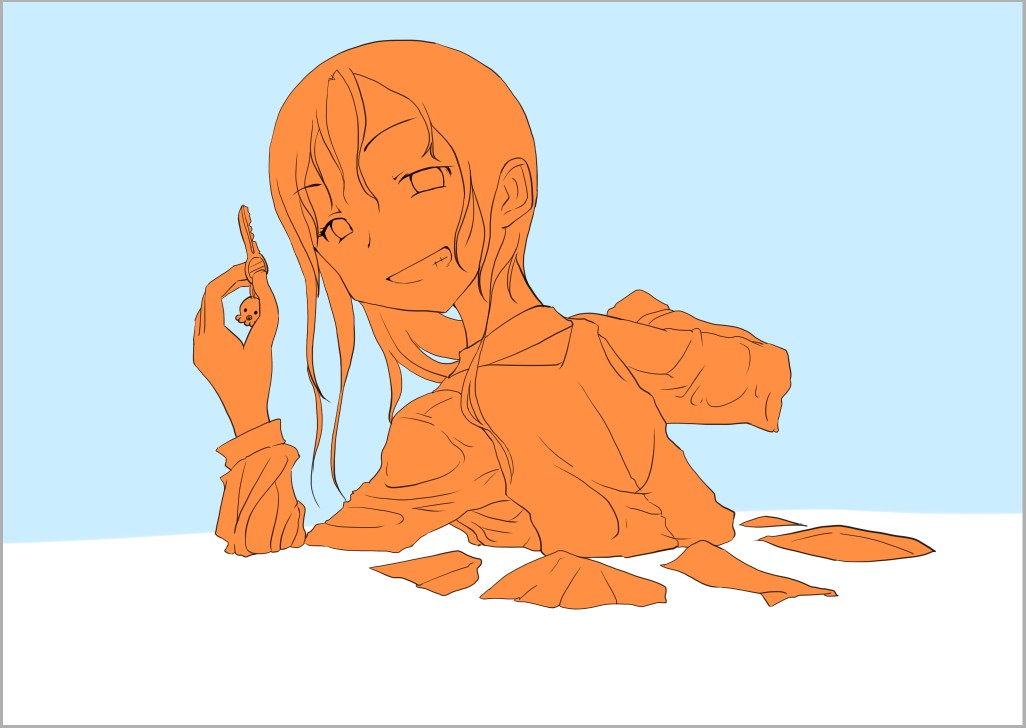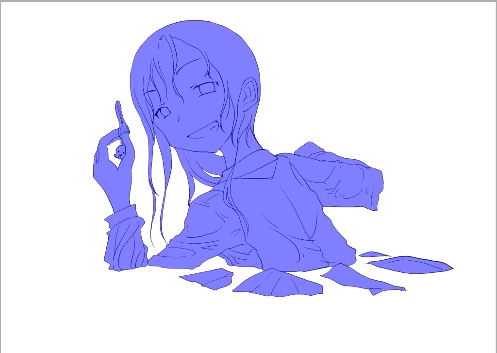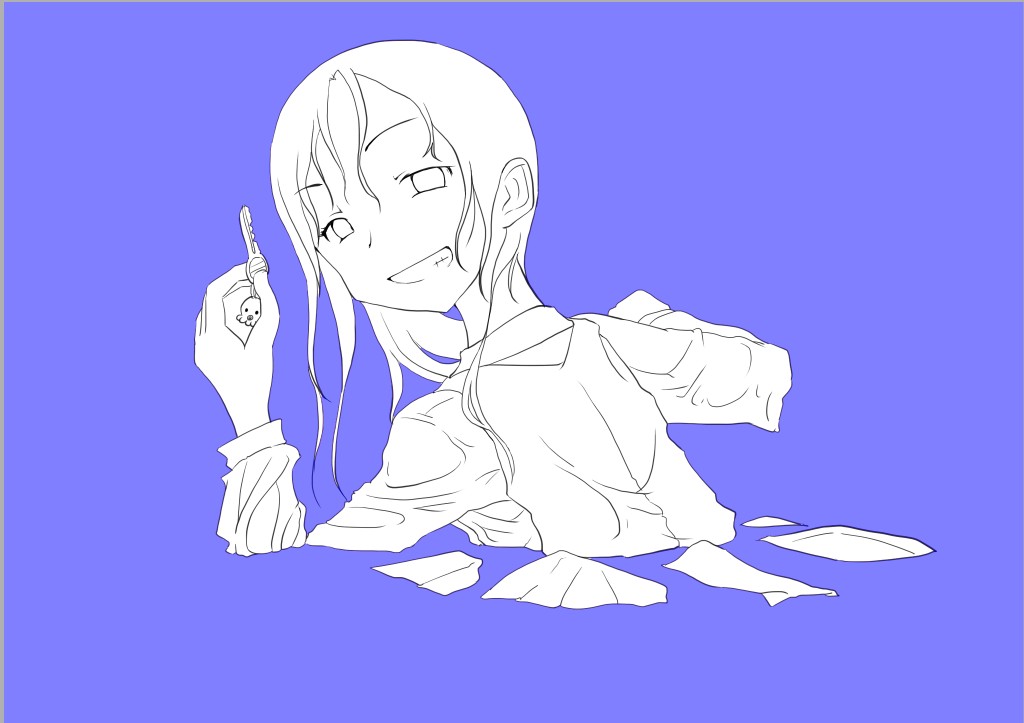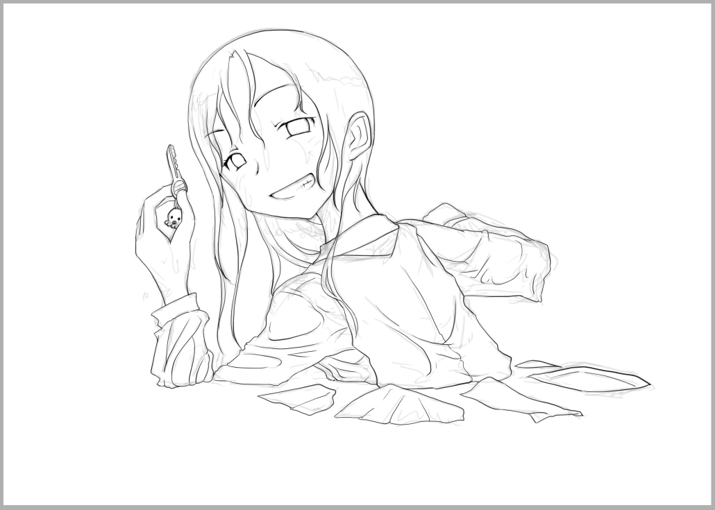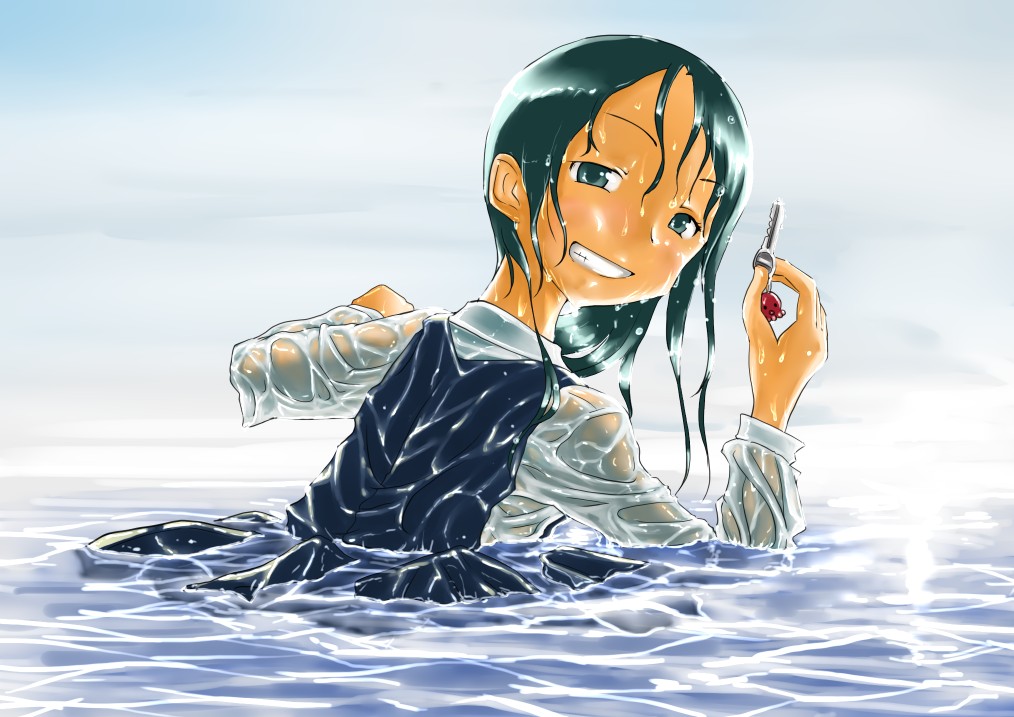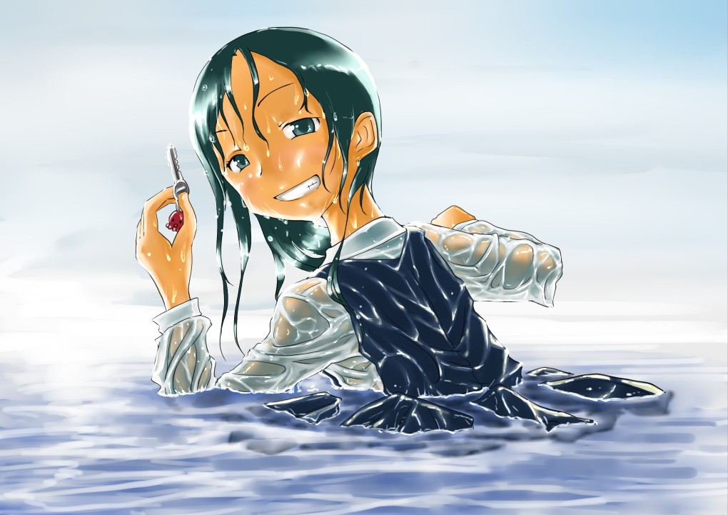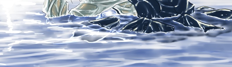 ラスト~!! 2010年10月06日 イベント 0 ようやっと、長かったイベントが終わりそうです…でも現在時刻は23:30…果たして今日中に終われるかな~無理だなまあ、日付をまたいで書きますか~ 瞳を塗っていく。その以前に何気にキーホルダーとか塗っちゃってますけど、まあ、基本は同じように塗ってます。まずは瞳を範囲選択して、適当に影響しない程度に離れているレイヤに色を付けて行く。もちろん新規でおいてもいいですけど、なんだかレイヤが勿体無いような気がするので…貧乏性ってやつですね。 範囲選択しおわったら、ザッと塗ってしまう。塗りのこしができていたらそこもきちっと穴埋めしておきます。塗り終わったら選択範囲を解除して不透明度を保護しておきます。 明るい色を水彩ツールで入れる。大体いつも瞳の色は髪の色から取ってることが多いですけど、明るい色も見ての通り、髪の明るいところの色です。 適度にぼかす。ぼかしと濃い色を再度塗る、明るい色を塗るを繰り返しながら、丁度良くなったと思ったら終了。 瞳に色が入っただけで、一気に絵っぽくなりました~次からはいよいよ、濡れてる水とか光ってる部分を描いていきます。 新規レイヤを一番上に用意。設定は加算にすると、丁度良くテカリみたいな感じになるので、大体いつも水滴とかそういうものは加算。他にも水滴の影をつけてから白で光をいれる方法もありますが、めんどく手間のわりにそれほど濡れてるっぽくならないような気がするので、こうやってます。 で、とりあえず瞳に光を描き入れて… あらびっくり、気づくとこんなに濡らして(ry 水滴を描きながら、髪や肌に一番強い光を入れて行く。その際、あんまりぼかしまくるよりも、元の肌の色とくっきりと分かれ目をつけていく感じだと、一層しっとり、というか、ぬっとりしている感じになる気がします。 とりあえず人物を中心に、体全体を濡らしていきます。大体ハイライト入れるところは人物の淵と、一番光が当たってると仮想するところ、ってかんじでしょうか。 近くで見るとこんな感じ、雫は丸いのは宙にある落下中のもの、垂れているのが肌についてるものって感じです。あと衣服についてはあんまり表面を垂れたりしないので、一番下の、例えばスカートの裾とかリボンの先とか、そういうところから雫がぽたぽた滴り落ちてるように描いていくとそれっぽくなるかもしれません。 そして最終的にぼかす…場所は水が垂れている場合を想像して、一番薄くなっているところ、つまり重力に従うなら上の方をぼかします。…まあ、ようは適当に悪目立ちしない感じにしていくってだけです。 人物の塗が粗方終わったら、最後の調整に入ります。って、ここで0:00になっちまったぜ… 背景と人物の間に新規レイヤを作成、水中をただようスカートを描いていく。ぼやっと、何となく見えるっぽくするために、ブラシなどの境界線があいまいなツールを使って適当に塗っていく。大体、波の暗くなっているところに塗っていけばいい感じ? はっきり描きすぎた場合は、消しゴムで消すよりもぼかした方がかえって目立たないかも。スカートの淵というか裾をはっきり目、それ以外を薄目という感じで描いていく。 何となくそれっぽくなったくらいでおわりにしておくところが肝心。かき込みすぎるとかえって目立ちすぎてしまうので、それとなくっぽくするのを目指す。 波や陽の光など、人物以外のハイライトをいれていく。一番上のレイヤに先ほどと同じように加算レイヤを作り、波に光を当てて行く。大体今まで描いていた上をなぞっていくような感じでしょうか? あと、人物と水面の境目の線画を消すように、上からハイライトを入れて行く。こうすることでより一層、人物と水とが一体化…するような…気がする…?そこらへんは、まあ、適当に。というか、Wetをいままでどれだけ観察してきたか、とかそこら辺の問題と言うよりも、漫画とか絵画の記号表現の一つ…みたいなもんですか? あらかた終わったら、逆にして変なところが無いか修正。波とか集中してかき込みすぎると、結構良く左に傾いていたりするので注意。傾いていた場合は何とか誤魔化す。 やっぱり肌の色が気に入らな方ので修正する。こういう修正を最終段階でする場合が結構多いので、最低限肌と服のレイヤはわけておくと後々便利かも知れませんね。 で、まあ色々とキラキラとかをちょいと描き足したりして、完成です~ ずっと書くのをわすれてましたが、とりあえずこれは105mmX148mm、350dpiで作成しました。出来上がったらとりあえずSAI形式で保存した後、Jpegに直して、いつもはそこからブログ用に50%リサイズしてます。 とまあ、大体こんな感じのが私の現在絵を描く時の全行程でしょうか?他にもあつぬりっぽいのとか、アニメっぽいのとか挑戦中ですが…はっきり色分けするのが苦手で、中々難しいですねぇ~まあ、そっち方面はおいおいって感じでしょうか?とまあ、一週間ほど続けて