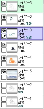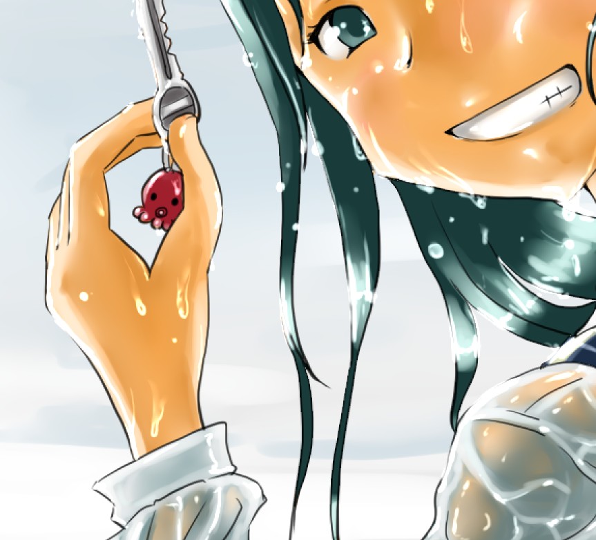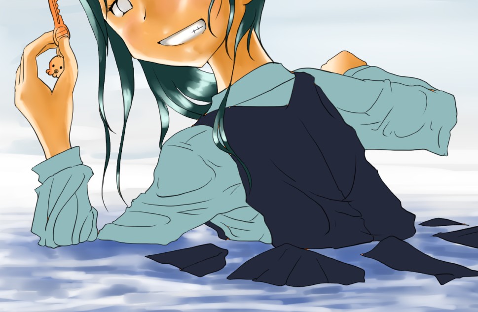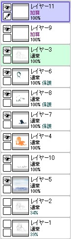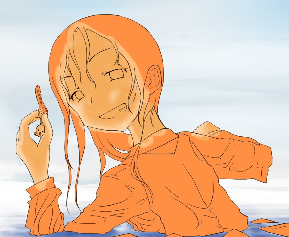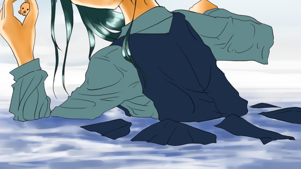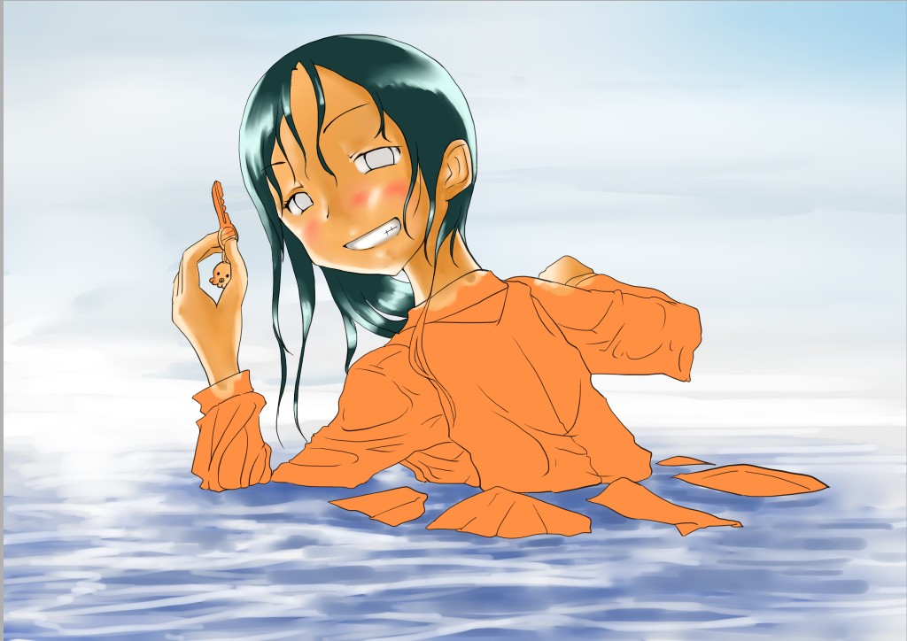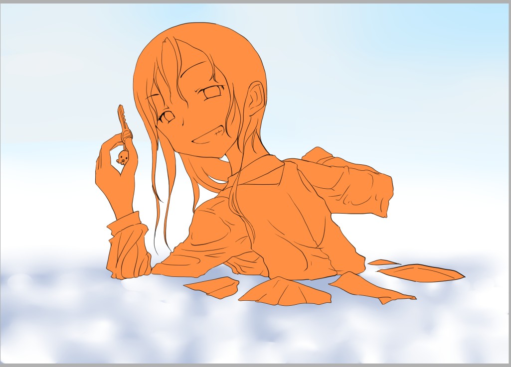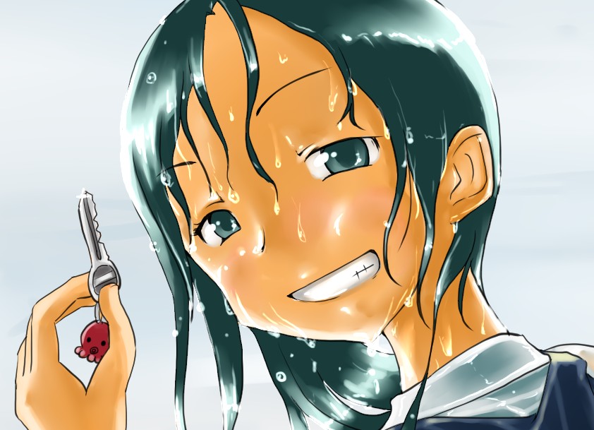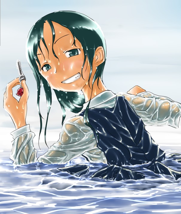 ラスト~!! 2010年10月06日 イベント 0 ようやっと、長かったイベントが終わりそうです…でも現在時刻は23:30…果たして今日中に終われるかな~無理だなまあ、日付をまたいで書きますか~ 瞳を塗っていく。その以前に何気にキーホルダーとか塗っちゃってますけど、まあ、基本は同じように塗ってます。まずは瞳を範囲選択して、適当に影響しない程度に離れているレイヤに色を付けて行く。もちろん新規でおいてもいいですけど、なんだかレイヤが勿体無いような気がするので…貧乏性ってやつですね。 範囲選択しおわったら、ザッと塗ってしまう。塗りのこしができていたらそこもきちっと穴埋めしておきます。塗り終わったら選択範囲を解除して不透明度を保護しておきます。 明るい色を水彩ツールで入れる。大体いつも瞳の色は髪の色から取ってることが多いですけど、明るい色も見ての通り、髪の明るいところの色です。 適度にぼかす。ぼかしと濃い色を再度塗る、明るい色を塗るを繰り返しながら、丁度良くなったと思ったら終了。 瞳に色が入っただけで、一気に絵っぽくなりました~次からはいよいよ、濡れてる水とか光ってる部分を描いていきます。 新規レイヤを一番上に用意。設定は加算にすると、丁度良くテカリみたいな感じになるので、大体いつも水滴とかそういうものは加算。他にも水滴の影をつけてから白で光をいれる方法もありますが、めんどく手間のわりにそれほど濡れてるっぽくならないような気がするので、こうやってます。 で、とりあえず瞳に光を描き入れて… あらびっくり、気づくとこんなに濡らして(ry 水滴を描きながら、髪や肌に一番強い光を入れて行く。その際、あんまりぼかしまくるよりも、元の肌の色とくっきりと分かれ目をつけていく感じだと、一層しっとり、というか、ぬっとりしている感じになる気がします。 とりあえず人物を中心に、体全体を濡らしていきます。大体ハイライト入れるところは人物の淵と、一番光が当たってると仮想するところ、ってかんじでしょうか。 近くで見るとこんな感じ、雫は丸いのは宙にある落下中のもの、垂れているのが肌についてるものって感じです。あと衣服についてはあんまり表面を垂れたりしないので、一番下の、例えばスカートの裾とかリボンの先とか、そういうところから雫がぽたぽた滴り落ちてるように描いていくとそれっぽくなるかもしれません。 そして最終的にぼかす…場所は水が垂れている場合を想像して、一番薄くなっているところ、つまり重力に従うなら上の方をぼかします。…まあ、ようは適当に悪目立ちしない感じにしていくってだけです。 人物の塗が粗方終わったら、最後の調整に入ります。って、ここで0:00になっちまったぜ… 背景と人物の間に新規レイヤを作成、水中をただようスカートを描いていく。ぼやっと、何となく見えるっぽくするために、ブラシなどの境界線があいまいなツールを使って適当に塗っていく。大体、波の暗くなっているところに塗っていけばいい感じ? はっきり描きすぎた場合は、消しゴムで消すよりもぼかした方がかえって目立たないかも。スカートの淵というか裾をはっきり目、それ以外を薄目という感じで描いていく。 何となくそれっぽくなったくらいでおわりにしておくところが肝心。かき込みすぎるとかえって目立ちすぎてしまうので、それとなくっぽくするのを目指す。 波や陽の光など、人物以外のハイライトをいれていく。一番上のレイヤに先ほどと同じように加算レイヤを作り、波に光を当てて行く。大体今まで描いていた上をなぞっていくような感じでしょうか? あと、人物と水面の境目の線画を消すように、上からハイライトを入れて行く。こうすることでより一層、人物と水とが一体化…するような…気がする…?そこらへんは、まあ、適当に。というか、Wetをいままでどれだけ観察してきたか、とかそこら辺の問題と言うよりも、漫画とか絵画の記号表現の一つ…みたいなもんですか? あらかた終わったら、逆にして変なところが無いか修正。波とか集中してかき込みすぎると、結構良く左に傾いていたりするので注意。傾いていた場合は何とか誤魔化す。 やっぱり肌の色が気に入らな方ので修正する。こういう修正を最終段階でする場合が結構多いので、最低限肌と服のレイヤはわけておくと後々便利かも知れませんね。 で、まあ色々とキラキラとかをちょいと描き足したりして、完成です~ ずっと書くのをわすれてましたが、とりあえずこれは105mmX148mm、350dpiで作成しました。出来上がったらとりあえずSAI形式で保存した後、Jpegに直して、いつもはそこからブログ用に50%リサイズしてます。 とまあ、大体こんな感じのが私の現在絵を描く時の全行程でしょうか?他にもあつぬりっぽいのとか、アニメっぽいのとか挑戦中ですが…はっきり色分けするのが苦手で、中々難しいですねぇ~まあ、そっち方面はおいおいって感じでしょうか?とまあ、一週間ほど続けて