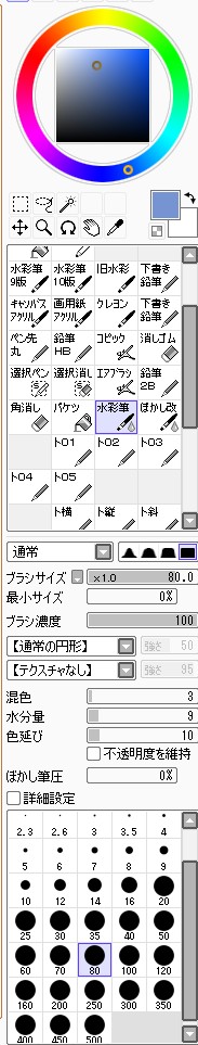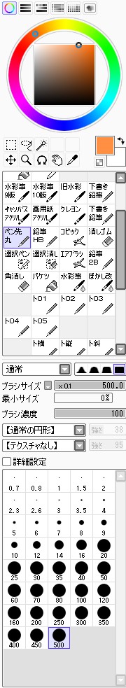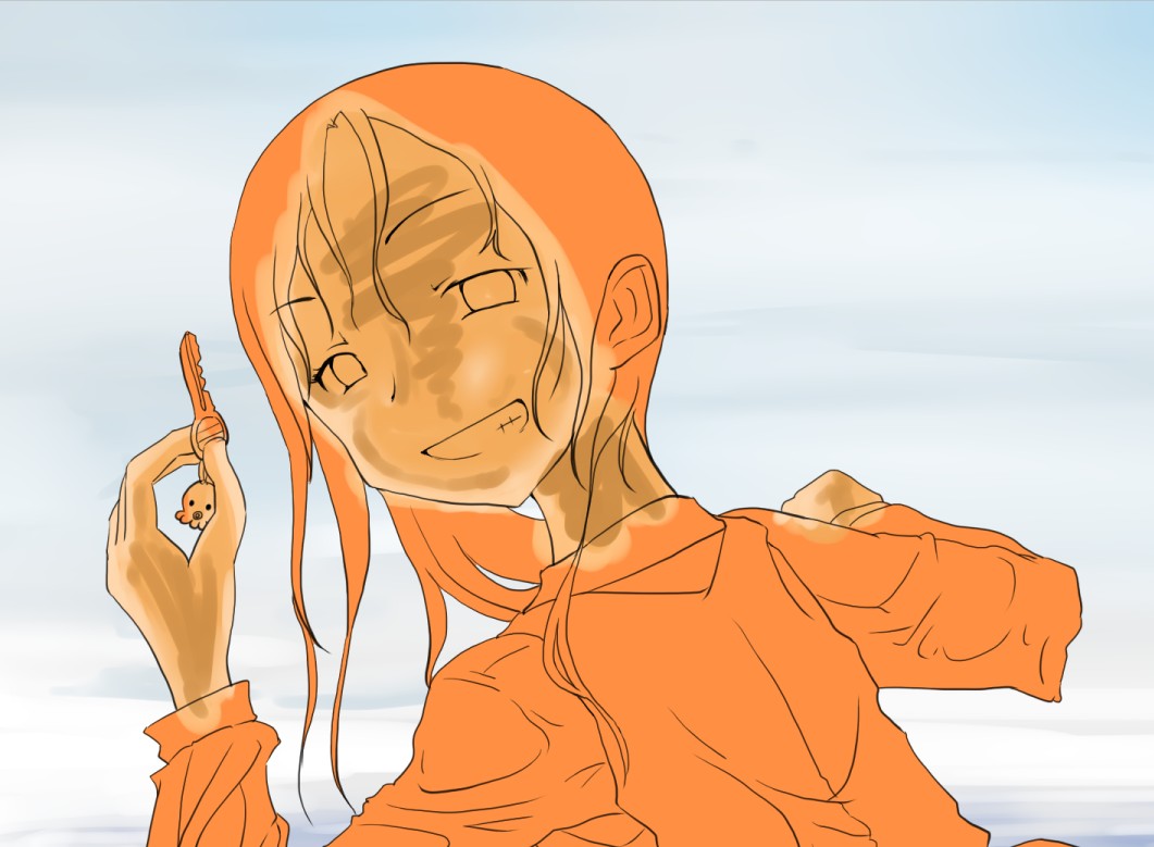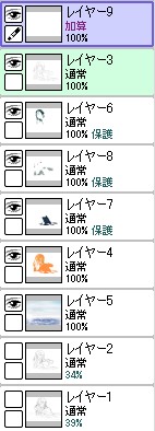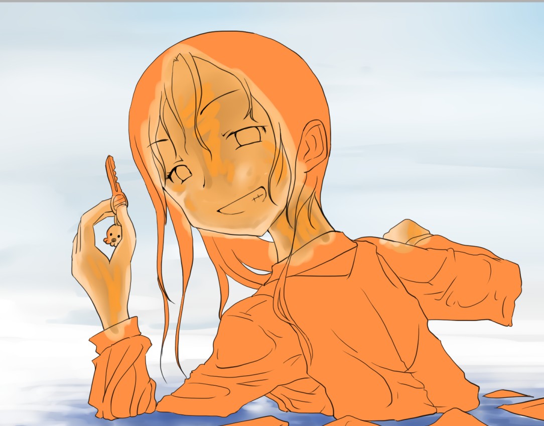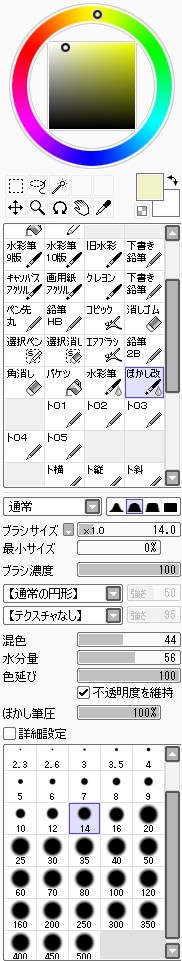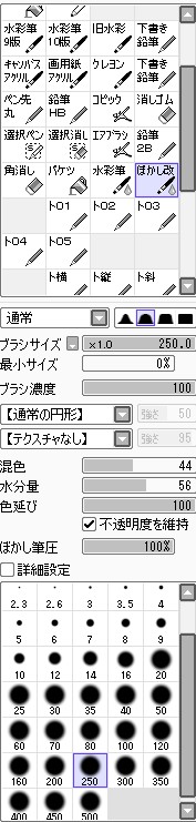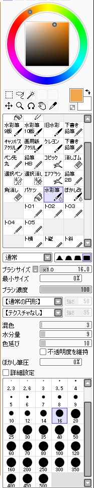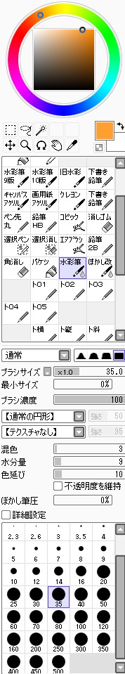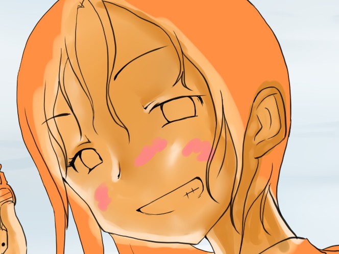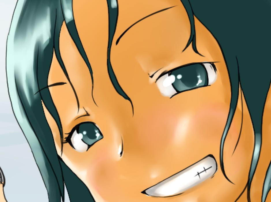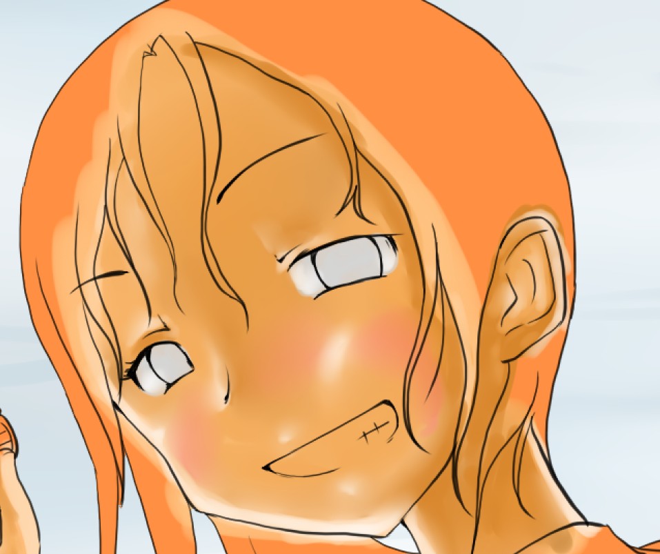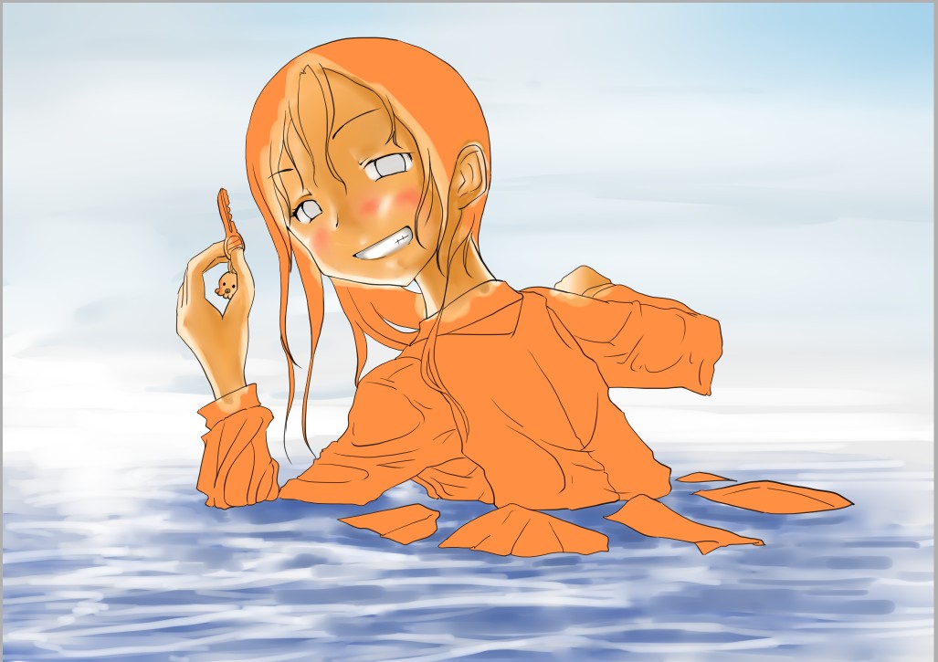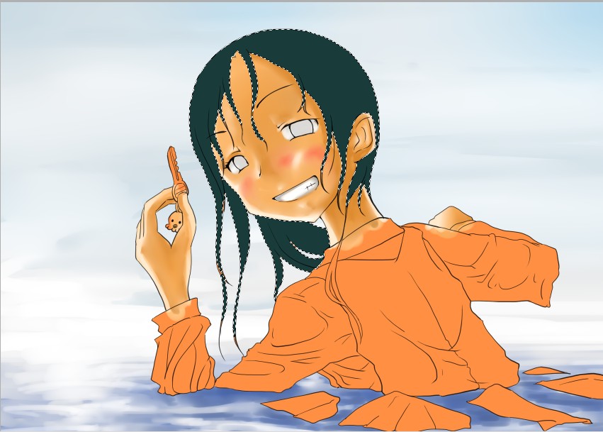 続き~ 2010年10月02日 イベント 2 前回の続きです正直な話、自分の為~とは言いつつも一連の記事を見て、あー自分も濡れた絵描きて~ってなってくれる人を期待してたりします何てったってニッチなジャンルですからね~他の人の濡れ絵をもっと見てみたい!できるだけ、質問には答えるようにしていきたいです…ここに書き込む気がひける方は、拍手でも何でも良いので言ってみて下さいませ~まあ、わかる範囲と言うか…私なんぞで良ければ答えますそこら辺は適当で~三回目~背景塗り 背景の前に、人物の下塗りをする。とりあえず人物以外の所をマジックワントで選択。 選択し終わったら、選択領域の反転で、人物を選択状態に。 かつてペン入れしてたツール。今は広範囲を塗るだけになってる。これでがーっと塗ると。色は肌色に近いオレンジ。何色でも良いと思います。新規レイヤに塗るのを忘れずに。 塗り残しとかはみ出しは、後々修正するので、いまはこれでOK。 背景用に新規レイヤを作成して、空と海?を塗る。イメージは朝、薄曇りの海。コピックってありますけど、要はさっきガーって塗った奴の細いバージョンみたいなもの。とりあえず大まかに塗る。後で修正すればいいはずなので。 ぼかしツールを用意。あんまりぼかしたくないときは細い設定で、グラデーションみたいにしたいときは太い設定で。一番使ってるかも。 今回は背景の下塗りを生かすため、中くらいの太さでぼかす。後々波の光と影の部分になるので、まだらに色を残す。 水彩筆を用意する。設定は上のような感じ。混色、色伸びともにあんまり使わない。というか使えない…イメージとしてはコピックみたいな使い方? さっきのまだらを活かしながら、色の濃い所を選ぶように適当にささっと塗っていく。後で修正が(ry塗り終わったら再びぼかす。 フィルターをかける。今回は昔の写真の色みたいなレトロな感じを意識して多少暗くかける。暗くすることでこの後光の部分を塗っていく時にメリハリがつくので。 雲になる部分と波の光の部分をササッと水彩で塗っていく。大体後でぼかすので大雑把に細かくはしない。 ぼかす。ぼかし依存症気味かも…でも、SAIはこのぼかしツールが優秀すぎるので、使わないのは勿体無い気がします。ペインターはウチのパソコンだと激重だけど、SAIは動作が軽いのも魅力ですね。 何となく色が薄かったので、色を濃くする。自分だけかもしれないけれど、大体カラーの明るさと濃さの範囲を出来るだけ広く使った方が、表現としてまとまりはないけど豪華になる気がします。あくまで気がするだけですが。 とりあえず背景はこのへんにしておいて(後で修正します)、人物に取り掛かります。塗る順番としては、肌から外側、上から下へ行くように塗ります。今回はできるだけレイヤをわけて描きますが、全部同一のレイヤで塗っていく方法もあります。その場合は下絵→上塗り→細かいところと、厚塗りの基本で塗っていくので、そこらへんはここよりももっと上手い説明で、達人な絵師様がごろごろしているので、そちらを参考にする方がいいかも~SAIのWikiとかのリンクをたどっていくと、良いこと歩きがします。 人物の下絵の上に、肌用のレイヤを作ります。このとき下のレイヤでクリッピングしておくと、範囲選択しなくてもはみ出さないので便利です。 色はとりあえずここらへん。人物の肌色は最終的にフィルターをかけることが多いので、正直どの色で塗ってるとかないです。過去の絵を見ればわかるとおり、すっごく適当でめちゃくちゃです。その時その時の直感で選んでます。個人的には赤っぽい肌色→黄色っぽい肌色の順に影→明るいところって感覚で塗っています。コツとしてはあんまり黒を混ぜない(思いっきり混ぜてますけど)、色の濃さだけを変えるのではなく、色相も変えて行くと深みと言うか、のっぺりした感じにならず、沈んだ感じにならないような気がします。 影→光の順に、先程から使用している水彩で塗っていく。塗り終わったら適当なところをぼかす。急に角度がついている所はそのまま、段々と球面のように角度が変わっている所はぼかす感じ。 逆行度合いが少なく感じたので、影を濃くするためにを混ぜる。でもこれは黒くしすぎorz。塗ったらぼかすのくりかえし。 黒くしすぎた場合は、明るい色でごまかす。塗ったらぼかす(ry 最終的にこんな感じに落ち着きました。肌は後から修正するので(ry 肌にピンクっぽい色をおいて、血色良くみせる。照れてたりするのを表現する時は、鼻の上まで塗ったり、もっと赤めの色にするといいかも? ぼかしで目立たないようにしつつ、わかるような感じで。この段階だと、明らかに失敗してますが。まあ、肌は(ry 影をさらに薄くする。こんな所で一応、肌塗りは終わりって感じ。まだハイライトは入れないので、正直よくわかんないんだけど、この先服とか塗るときの目安になる所だし、大体どの人物も、肌色だけは変わらない