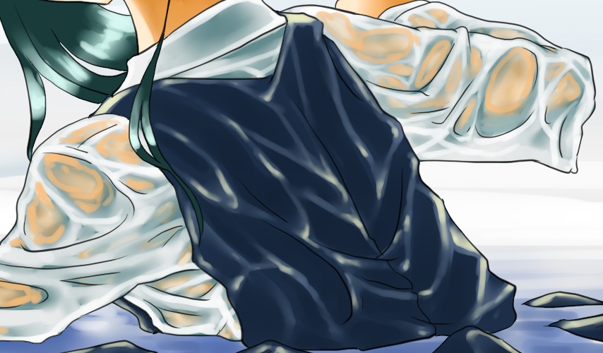 都筑~ 2010年10月04日 イベント 0 ブラウス塗っていきます。まずは明るくなっている部分から。感じとしては、網目状にシワができる感じで、普通の時の衣服のシワが、そのまま身体にぴったり張り付くのを想像しながら塗っていく。肌が透ける予定なので、その部分は後から塗っていく。 とりあえずぼかす。感じとしては水面の波を描いた時よりも弱めに、髪やジャンスカよりも強めに全体にばばっとかけてく感じ。 先程よりも強い光の部分を塗っていく。こうすることでぼやっとグラデーションになっている所と、はっきり影と光がついているところを分ける。同時に影の部分も足したり、まあ色々とやっていく感じです。 肌の透けてる所を塗る。はじめは適当に、腕が通っている所で、シワにならずに肌に密着している所を大まかに塗ってぼかす。そしてシワの部分の色をスポイトして強調→肌をスポイトして広げるって感じで段々と質感?みたいなものを描いていく。 ちなみに自分の中でブラウスとか比較的薄目の化繊とか綿が濡れた時って、けっこうプルプルしているような、そんな印象があるので、固くならないように柔らかく、影をはっきりさせないで塗っていくようにしています。 何か全体的に暗かったんで修正。これも比較的思い切ってやるのが良いような気がします。どうしても迷って、折角のおきにい入りな感じに出来た部分を消したくないときは、別レイヤで作業して、レイヤの表示を消したりつけたりしながら描いていくといいような気がします。あと、今回解ったのは、肌に何かしら張り付いてる感じを出すには、張り付いている部分の淵を強調したりするといい感じになるかも?って事でしょうか? で、色々あってこうなったと。変わりすぎっすね…スクショを取ってなかったんで、過程が説明しずらいですが、肌を粗方塗った後、腕にはりついて影になっている部分をエアブラシとかの描くときの境界線が曖昧なツールを使って大雑把に塗った後、肌や服の各部分から色をスポイトして再び水彩ツールで描く、って感じのことを二回くらい繰り返しました。 まぁ、後で修正(ry今回の結論:肌が透けるって難しい…中々服の中の身体の感じとかを表現しながら、それにまとわりついてる衣類を描くのが大変。でも、透けてるとより一層濡れてるって感じがするので良いですね~ 何より描いてる最中、楽しいしね!!!つづく