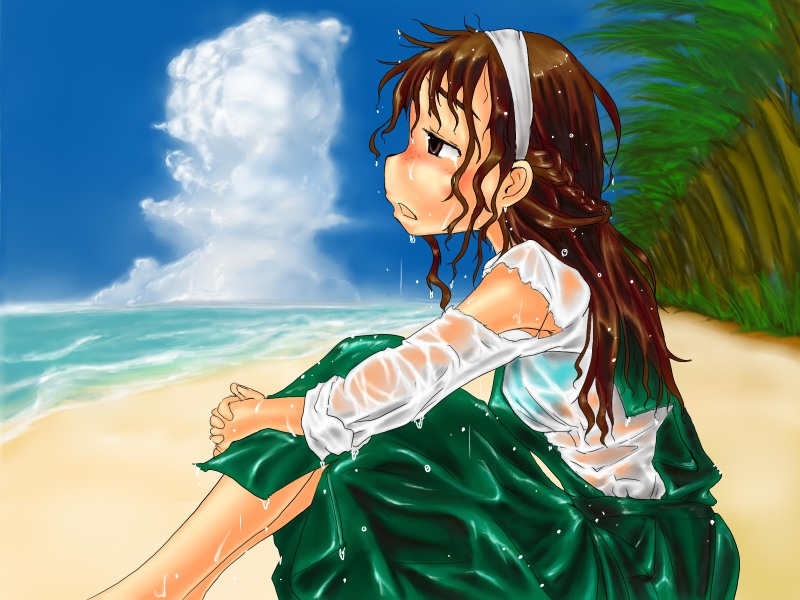 夏らしいものを描こう 2009年06月18日 制服濡れ 0 と思ったら、なんだか悲惨な絵になってしまいました…多分乗ってた船が嵐で傾いて、一人だけ船外に放り出され、潮に流されてきたんでしょうねようやく辿り着いた陸地は、どう見ても南洋の無人島ああ、あんな船に乗るんじゃなかった…と、クラスの他のみんなは、今頃どうしてるだろうか、私の事探してくれてるだろうか…なんて思いながら、途方にくれるしかない感じ…ですかね学校じゃ案外美人のお嬢様系だったけど、服はボロボロ、髪はボサボサ、靴も靴下も流され、ずぶぬれだし塩でべたべたするしみじめだし…ああ!なんていいんだ(この変体め!)でもまあ落ちとしては、実は島の裏側に集落があって、半日もせずに救助される…ってのが一番いいでしょうけど~そういえば中学生の頃、無人島に好きな人と一緒に漂流してーとか思ってましたね(笑)いや、そういう何かあるでしょ!?中学二年生ぐらいには!!あ、今m(ry