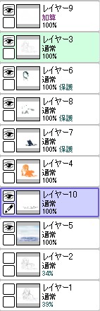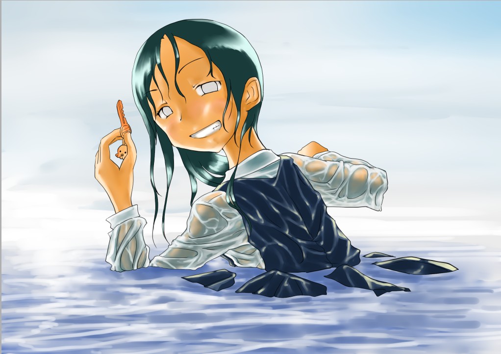 ラスト~!! 2010年10月06日 イベント 0 ようやっと、長かったイベントが終わりそうです…でも現在時刻は23:30…果たして今日中に終われるかな~無理だなまあ、日付をまたいで書きますか~ 瞳を塗っていく。その以前に何気にキーホルダーとか塗っちゃってますけど、まあ、基本は同じように塗ってます。まずは瞳を範囲選択して、適当に影響しない程度に離れているレイヤに色を付けて行く。もちろん新規でおいてもいいですけど、なんだかレイヤが勿体無いような気がするので…貧乏性ってやつですね。 範囲選択しおわったら、ザッと塗ってしまう。塗りのこしができていたらそこもきちっと穴埋めしておきます。塗り終わったら選択範囲を解除して不透明度を保護しておきます。 明るい色を水彩ツールで入れる。大体いつも瞳の色は髪の色から取ってることが多いですけど、明るい色も見ての通り、髪の明るいところの色です。 適度にぼかす。ぼかしと濃い色を再度塗る、明るい色を塗るを繰り返しながら、丁度良くなったと思ったら終了。 瞳に色が入っただけで、一気に絵っぽくなりました~次からはいよいよ、濡れてる水とか光ってる部分を描いていきます。 新規レイヤを一番上に用意。設定は加算にすると、丁度良くテカリみたいな感じになるので、大体いつも水滴とかそういうものは加算。他にも水滴の影をつけてから白で光をいれる方法もありますが、めんどく手間のわりにそれほど濡れてるっぽくならないような気がするので、こうやってます。 で、とりあえず瞳に光を描き入れて… あらびっくり、気づくとこんなに濡らして(ry 水滴を描きながら、髪や肌に一番強い光を入れて行く。その際、あんまりぼかしまくるよりも、元の肌の色とくっきりと分かれ目をつけていく感じだと、一層しっとり、というか、ぬっとりしている感じになる気がします。 とりあえず人物を中心に、体全体を濡らしていきます。大体ハイライト入れるところは人物の淵と、一番光が当たってると仮想するところ、ってかんじでしょうか。 近くで見るとこんな感じ、雫は丸いのは宙にある落下中のもの、垂れているのが肌についてるものって感じです。あと衣服についてはあんまり表面を垂れたりしないので、一番下の、例えばスカートの裾とかリボンの先とか、そういうところから雫がぽたぽた滴り落ちてるように描いていくとそれっぽくなるかもしれません。 そして最終的にぼかす…場所は水が垂れている場合を想像して、一番薄くなっているところ、つまり重力に従うなら上の方をぼかします。…まあ、ようは適当に悪目立ちしない感じにしていくってだけです。 人物の塗が粗方終わったら、最後の調整に入ります。って、ここで0:00になっちまったぜ… 背景と人物の間に新規レイヤを作成、水中をただようスカートを描いていく。ぼやっと、何となく見えるっぽくするために、ブラシなどの境界線があいまいなツールを使って適当に塗っていく。大体、波の暗くなっているところに塗っていけばいい感じ? はっきり描きすぎた場合は、消しゴムで消すよりもぼかした方がかえって目立たないかも。スカートの淵というか裾をはっきり目、それ以外を薄目という感じで描いていく。 何となくそれっぽくなったくらいでおわりにしておくところが肝心。かき込みすぎるとかえって目立ちすぎてしまうので、それとなくっぽくするのを目指す。 波や陽の光など、人物以外のハイライトをいれていく。一番上のレイヤに先ほどと同じように加算レイヤを作り、波に光を当てて行く。大体今まで描いていた上をなぞっていくような感じでしょうか? あと、人物と水面の境目の線画を消すように、上からハイライトを入れて行く。こうすることでより一層、人物と水とが一体化…するような…気がする…?そこらへんは、まあ、適当に。というか、Wetをいままでどれだけ観察してきたか、とかそこら辺の問題と言うよりも、漫画とか絵画の記号表現の一つ…みたいなもんですか? あらかた終わったら、逆にして変なところが無いか修正。波とか集中してかき込みすぎると、結構良く左に傾いていたりするので注意。傾いていた場合は何とか誤魔化す。 やっぱり肌の色が気に入らな方ので修正する。こういう修正を最終段階でする場合が結構多いので、最低限肌と服のレイヤはわけておくと後々便利かも知れませんね。 で、まあ色々とキラキラとかをちょいと描き足したりして、完成です~ ずっと書くのをわすれてましたが、とりあえずこれは105mmX148mm、350dpiで作成しました。出来上がったらとりあえずSAI形式で保存した後、Jpegに直して、いつもはそこからブログ用に50%リサイズしてます。 とまあ、大体こんな感じのが私の現在絵を描く時の全行程でしょうか?他にもあつぬりっぽいのとか、アニメっぽいのとか挑戦中ですが…はっきり色分けするのが苦手で、中々難しいですねぇ~まあ、そっち方面はおいおいって感じでしょうか?とまあ、一週間ほど続けて