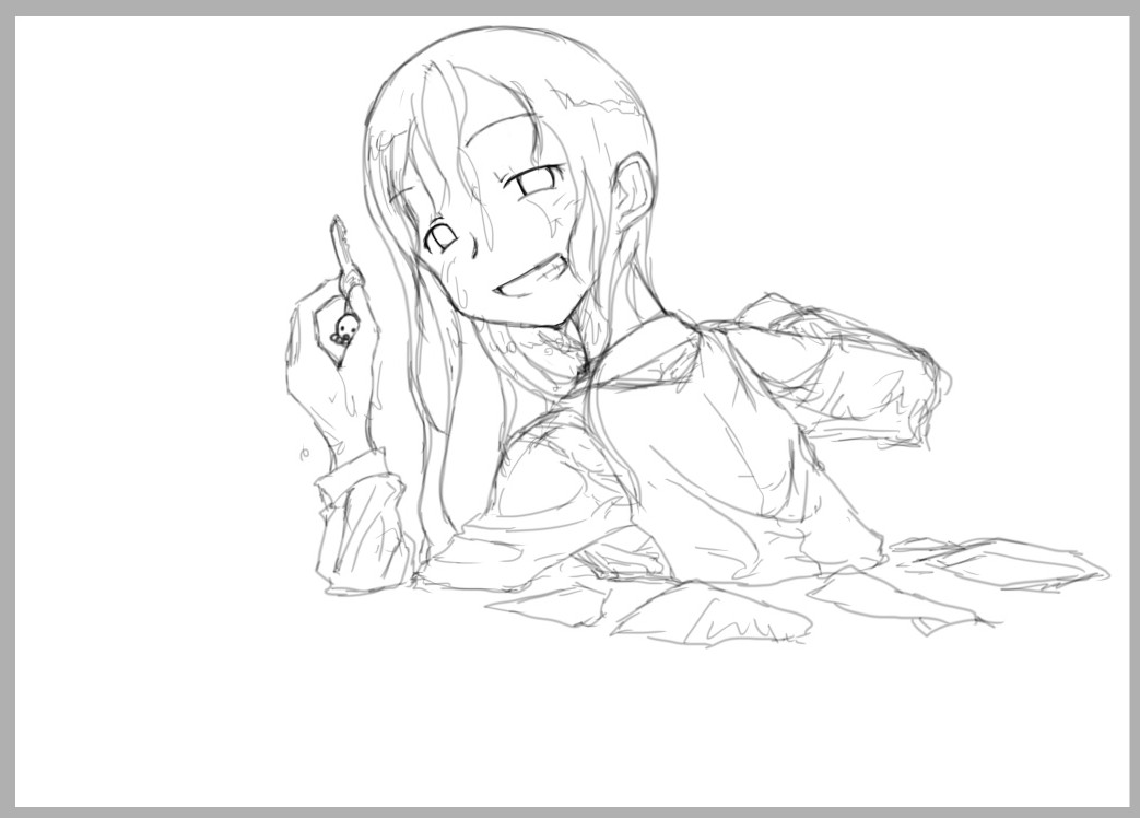予告通り 2010年09月30日 イベント 0 誰が望むかは知りませんが、絵の描き方…というより、私はこんな感じで描いてます的なページが一つくらいあってもいいかな~って思いつきではじめました題して、「濡れた絵の描き方?線画編」ぶっちゃけ、こんなん晒しておいても意味はないかもしれないですが自分が一応、戻ってこれる、いわば目印的なハウツー記事を書いておくのも楽しいかな~って程度ですんで、物好きな方だけ眺めていただければ幸いです環境:ノートPCにXP、mem2G、celeron540、外部出力モニタをアナログ接続 WacomIntuos4A5サイズ、付属の太いペン軸使用 SAIver1.0.11、まずは下書き(ラフ)から 適当に、頭に浮かんだままのものを、出来る限り正確に写し取るような感覚で、人物の輪郭から表情、髪、身体、手足の順番に描いていく。途中手や足を強調したい場合や、極端にパースをつける場合はその限りではない。ポーズや資料はあんまり見ない。なので結構バランスとかは適当。参考にするといけないと思います。 で、出来たのが上の絵。鍵を探して海?に飛び込んで、ほら、あったよー!的な場面を想像。全体を何となく描いた後、選択ペンツール+移動で頭や身体、手の大きさを、何となく整える。コツ?かどうかはわからないけれど、感覚的には自分の身体の頭とか腕の長さの比を、そのまま参考にしているような感じ+頭を大きく、大体6.5等身から7.5等身くらいを目安に描く。 拡大図。拡大すればわかる通り、最大濃度を抑えた黒鉛筆で下書きを行っている。全体の形が大体取れたら、その後細かいところを適当に修正する。あんまり描き込むと、わけがわからなくなるのでほどほどにしておくのがコツ? 使ったツールの設定。同じ名前のものが上にもあるが、そちらの方は濃度60で輪郭を固くしてあるため、もっとくっきりと下書きが出来る。鉛筆風の絵も描ける。※ツールの設定は結構個人の差があるので、そこらへんは自由に自分の描きやすいものを探した方がいいかもしれません。 先程のレイヤーの濃度を大体30%くらいに下げ、さらに上に下書き(仕上げ)を行う。このとき、視点をぐるぐる動かしたとしても、SAIはそれほど画像が荒くならないので凄く描きやすい。まだ下書きなので、のびのび描く。あと細かいところは出来るだけ正確に描いておくと後が楽に。下絵に縛られず、どんどん良いと思ったように変えていくと良いような…ダメなような…。 下書き(仕上げ)完成。前とは表情が結構変わった。よりシンプルに線を選んでいくようにすると良い?中々最初のラフの良さを生かしきれないのが課題。 同じレイヤに、濃いめの鉛筆ではっきり線がわかるように描き込んでいく。描き込む箇所は、大体、ペン入れをする時ペンが太くなる所や、目や口など表情の所。これもあんまり描き込みすぎるとぐちゃぐちゃになるのでホドホドにしておく。あと、線画に反映するところだけ描いていく。例えば頬の赤みや、雫など、線画を描かない所は無視しておく。こうすることによって、よりすっきりした画面で、迷いなく本書きが出来るような気がする。 で、出来たのが上の絵。やっぱり雰囲気が乗らないので雫とか濡れてる表現を付けてみる。こうすることによってモチベ―ジョンが高まる(ぉぃ。表情は納得するまで描くしかないのかも。上手い人は一発でババっと描いちゃうけど、まだまだそんなことは無理。でも悩んであれこれ下書きしてる時が一番楽しいかも。色塗りも好きだけど、下書きとか落書きの方がもっと好きだし、なにより楽だし。 反転させてバランスを見ながら、画面の良いところに配置する。黄金比、とか考えてみるけど、結局は感覚と、描きたいところが真ん中になってしまうような気がする。画面構成の勉強も必要。でもそうすると濡れた服が描けないんだよなぁ~…。 一番最初に描いたラフとの比較。こんだけ動いてる。 そして次からペン入れです。つづくっとまあ、こんな感じのものを、明日も書ければいいなぁ~因みにこの絵、まだ仕上がってません(ぉぃ全然、濡れた絵の描き方じゃなかったね…orz PR