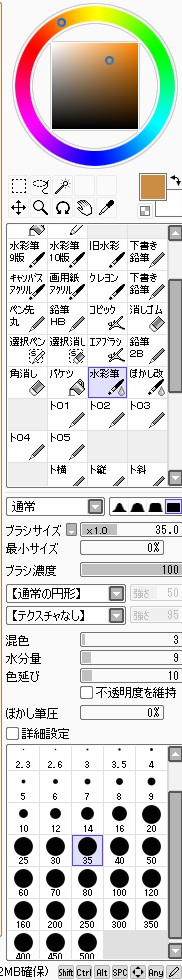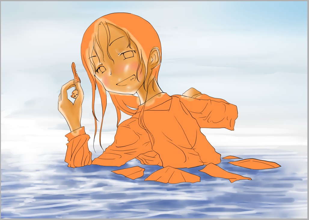 続き~ 2010年10月02日 イベント 2 前回の続きです正直な話、自分の為~とは言いつつも一連の記事を見て、あー自分も濡れた絵描きて~ってなってくれる人を期待してたりします何てったってニッチなジャンルですからね~他の人の濡れ絵をもっと見てみたい!できるだけ、質問には答えるようにしていきたいです…ここに書き込む気がひける方は、拍手でも何でも良いので言ってみて下さいませ~まあ、わかる範囲と言うか…私なんぞで良ければ答えますそこら辺は適当で~三回目~背景塗り 背景の前に、人物の下塗りをする。とりあえず人物以外の所をマジックワントで選択。 選択し終わったら、選択領域の反転で、人物を選択状態に。 かつてペン入れしてたツール。今は広範囲を塗るだけになってる。これでがーっと塗ると。色は肌色に近いオレンジ。何色でも良いと思います。新規レイヤに塗るのを忘れずに。 塗り残しとかはみ出しは、後々修正するので、いまはこれでOK。 背景用に新規レイヤを作成して、空と海?を塗る。イメージは朝、薄曇りの海。コピックってありますけど、要はさっきガーって塗った奴の細いバージョンみたいなもの。とりあえず大まかに塗る。後で修正すればいいはずなので。 ぼかしツールを用意。あんまりぼかしたくないときは細い設定で、グラデーションみたいにしたいときは太い設定で。一番使ってるかも。 今回は背景の下塗りを生かすため、中くらいの太さでぼかす。後々波の光と影の部分になるので、まだらに色を残す。 水彩筆を用意する。設定は上のような感じ。混色、色伸びともにあんまり使わない。というか使えない…イメージとしてはコピックみたいな使い方? さっきのまだらを活かしながら、色の濃い所を選ぶように適当にささっと塗っていく。後で修正が(ry塗り終わったら再びぼかす。 フィルターをかける。今回は昔の写真の色みたいなレトロな感じを意識して多少暗くかける。暗くすることでこの後光の部分を塗っていく時にメリハリがつくので。 雲になる部分と波の光の部分をササッと水彩で塗っていく。大体後でぼかすので大雑把に細かくはしない。 ぼかす。ぼかし依存症気味かも…でも、SAIはこのぼかしツールが優秀すぎるので、使わないのは勿体無い気がします。ペインターはウチのパソコンだと激重だけど、SAIは動作が軽いのも魅力ですね。 何となく色が薄かったので、色を濃くする。自分だけかもしれないけれど、大体カラーの明るさと濃さの範囲を出来るだけ広く使った方が、表現としてまとまりはないけど豪華になる気がします。あくまで気がするだけですが。 とりあえず背景はこのへんにしておいて(後で修正します)、人物に取り掛かります。塗る順番としては、肌から外側、上から下へ行くように塗ります。今回はできるだけレイヤをわけて描きますが、全部同一のレイヤで塗っていく方法もあります。その場合は下絵→上塗り→細かいところと、厚塗りの基本で塗っていくので、そこらへんはここよりももっと上手い説明で、達人な絵師様がごろごろしているので、そちらを参考にする方がいいかも~SAIのWikiとかのリンクをたどっていくと、良いこと歩きがします。 人物の下絵の上に、肌用のレイヤを作ります。このとき下のレイヤでクリッピングしておくと、範囲選択しなくてもはみ出さないので便利です。 色はとりあえずここらへん。人物の肌色は最終的にフィルターをかけることが多いので、正直どの色で塗ってるとかないです。過去の絵を見ればわかるとおり、すっごく適当でめちゃくちゃです。その時その時の直感で選んでます。個人的には赤っぽい肌色→黄色っぽい肌色の順に影→明るいところって感覚で塗っています。コツとしてはあんまり黒を混ぜない(思いっきり混ぜてますけど)、色の濃さだけを変えるのではなく、色相も変えて行くと深みと言うか、のっぺりした感じにならず、沈んだ感じにならないような気がします。 影→光の順に、先程から使用している水彩で塗っていく。塗り終わったら適当なところをぼかす。急に角度がついている所はそのまま、段々と球面のように角度が変わっている所はぼかす感じ。 逆行度合いが少なく感じたので、影を濃くするためにを混ぜる。でもこれは黒くしすぎorz。塗ったらぼかすのくりかえし。 黒くしすぎた場合は、明るい色でごまかす。塗ったらぼかす(ry 最終的にこんな感じに落ち着きました。肌は後から修正するので(ry 肌にピンクっぽい色をおいて、血色良くみせる。照れてたりするのを表現する時は、鼻の上まで塗ったり、もっと赤めの色にするといいかも? ぼかしで目立たないようにしつつ、わかるような感じで。この段階だと、明らかに失敗してますが。まあ、肌は(ry 影をさらに薄くする。こんな所で一応、肌塗りは終わりって感じ。まだハイライトは入れないので、正直よくわかんないんだけど、この先服とか塗るときの目安になる所だし、大体どの人物も、肌色だけは変わらない