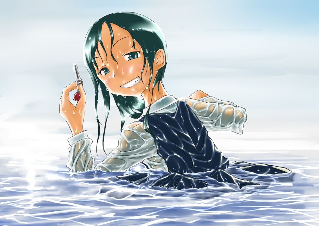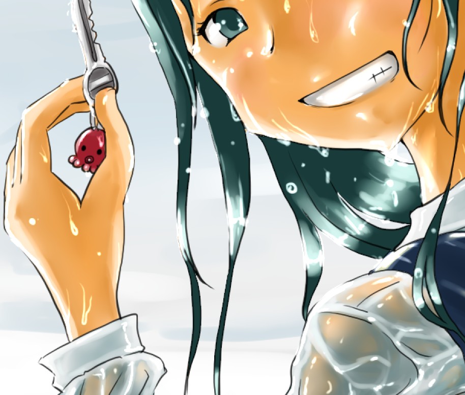 ラスト~!! 2010年10月06日 イベント 0 ようやっと、長かったイベントが終わりそうです…でも現在時刻は23:30…果たして今日中に終われるかな~無理だなまあ、日付をまたいで書きますか~ 瞳を塗っていく。その以前に何気にキーホルダーとか塗っちゃってますけど、まあ、基本は同じように塗ってます。まずは瞳を範囲選択して、適当に影響しない程度に離れているレイヤに色を付けて行く。もちろん新規でおいてもいいですけど、なんだかレイヤが勿体無いような気がするので…貧乏性ってやつですね。 範囲選択しおわったら、ザッと塗ってしまう。塗りのこしができていたらそこもきちっと穴埋めしておきます。塗り終わったら選択範囲を解除して不透明度を保護しておきます。 明るい色を水彩ツールで入れる。大体いつも瞳の色は髪の色から取ってることが多いですけど、明るい色も見ての通り、髪の明るいところの色です。 適度にぼかす。ぼかしと濃い色を再度塗る、明るい色を塗るを繰り返しながら、丁度良くなったと思ったら終了。 瞳に色が入っただけで、一気に絵っぽくなりました~次からはいよいよ、濡れてる水とか光ってる部分を描いていきます。 新規レイヤを一番上に用意。設定は加算にすると、丁度良くテカリみたいな感じになるので、大体いつも水滴とかそういうものは加算。他にも水滴の影をつけてから白で光をいれる方法もありますが、めんどく手間のわりにそれほど濡れてるっぽくならないような気がするので、こうやってます。 で、とりあえず瞳に光を描き入れて… あらびっくり、気づくとこんなに濡らして(ry 水滴を描きながら、髪や肌に一番強い光を入れて行く。その際、あんまりぼかしまくるよりも、元の肌の色とくっきりと分かれ目をつけていく感じだと、一層しっとり、というか、ぬっとりしている感じになる気がします。 とりあえず人物を中心に、体全体を濡らしていきます。大体ハイライト入れるところは人物の淵と、一番光が当たってると仮想するところ、ってかんじでしょうか。 近くで見るとこんな感じ、雫は丸いのは宙にある落下中のもの、垂れているのが肌についてるものって感じです。あと衣服についてはあんまり表面を垂れたりしないので、一番下の、例えばスカートの裾とかリボンの先とか、そういうところから雫がぽたぽた滴り落ちてるように描いていくとそれっぽくなるかもしれません。 そして最終的にぼかす…場所は水が垂れている場合を想像して、一番薄くなっているところ、つまり重力に従うなら上の方をぼかします。…まあ、ようは適当に悪目立ちしない感じにしていくってだけです。 人物の塗が粗方終わったら、最後の調整に入ります。って、ここで0:00になっちまったぜ… 背景と人物の間に新規レイヤを作成、水中をただようスカートを描いていく。ぼやっと、何となく見えるっぽくするために、ブラシなどの境界線があいまいなツールを使って適当に塗っていく。大体、波の暗くなっているところに塗っていけばいい感じ? はっきり描きすぎた場合は、消しゴムで消すよりもぼかした方がかえって目立たないかも。スカートの淵というか裾をはっきり目、それ以外を薄目という感じで描いていく。 何となくそれっぽくなったくらいでおわりにしておくところが肝心。かき込みすぎるとかえって目立ちすぎてしまうので、それとなくっぽくするのを目指す。 波や陽の光など、人物以外のハイライトをいれていく。一番上のレイヤに先ほどと同じように加算レイヤを作り、波に光を当てて行く。大体今まで描いていた上をなぞっていくような感じでしょうか? あと、人物と水面の境目の線画を消すように、上からハイライトを入れて行く。こうすることでより一層、人物と水とが一体化…するような…気がする…?そこらへんは、まあ、適当に。というか、Wetをいままでどれだけ観察してきたか、とかそこら辺の問題と言うよりも、漫画とか絵画の記号表現の一つ…みたいなもんですか? あらかた終わったら、逆にして変なところが無いか修正。波とか集中してかき込みすぎると、結構良く左に傾いていたりするので注意。傾いていた場合は何とか誤魔化す。 やっぱり肌の色が気に入らな方ので修正する。こういう修正を最終段階でする場合が結構多いので、最低限肌と服のレイヤはわけておくと後々便利かも知れませんね。 で、まあ色々とキラキラとかをちょいと描き足したりして、完成です~ ずっと書くのをわすれてましたが、とりあえずこれは105mmX148mm、350dpiで作成しました。出来上がったらとりあえずSAI形式で保存した後、Jpegに直して、いつもはそこからブログ用に50%リサイズしてます。 とまあ、大体こんな感じのが私の現在絵を描く時の全行程でしょうか?他にもあつぬりっぽいのとか、アニメっぽいのとか挑戦中ですが…はっきり色分けするのが苦手で、中々難しいですねぇ~まあ、そっち方面はおいおいって感じでしょうか?とまあ、一週間ほど続けて
